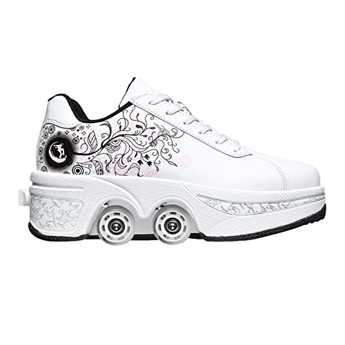 ScificWom Roller Skates rullskridskoskor, 2-i-1 multifunktionella skor med hjul, Kick Roller Shoes, rullskridskoskor, justerbara skor med fyra hjul, skridskoskor, silvervit 38