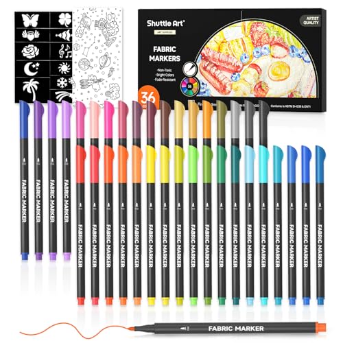 Shuttle Art tygpennor, 36 färger fin spets permanenta tygmarkörer för kläder, T-shirt, skor med 11 schabloner 1 tygblad, giftfria markörpennor för barn vuxna målning skrift