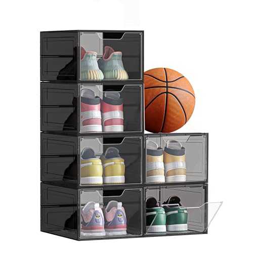 SONGMICS Skoboxar, med dörr, transparent, set om 6, stapelbara, enkel montering, 34 x 25 x 18,4 cm, för skor upp till storlek 44, transparent svart LSP406B01