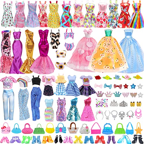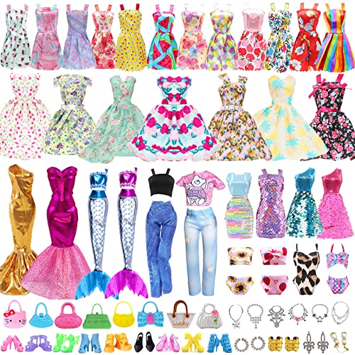 Dockkläder och tillbehör, 57 delar, 3 blomklänningar, 1 paljettklänningar, 2 aftonklänning, 3 toppar och byxor, 5 bikinis, 3 miniklänningar, 10 par skor, 10 väskor, 10 smycken för docka (slumpmässiga)