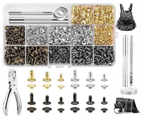 Hålnitar för läder, lädernitar, antik mässing, 6/8 mm läder, dubbla nitar, bältesnitar med 4 verktyg, för gör-det-själv- läderhantverk, reparation av väskor, skor, bälten (guld, silver, koppar), 210 stycken