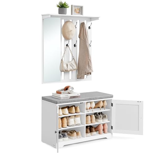 VASAGLE Skobänk vägggarderobsset, garderob med spegel, 8 dubbla krokar, skoskåp med justerbara hyllor, dubbeldörrar, sittbänk, avtagbar, 82 cm bred, molnvit LSC010W01