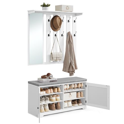 VASAGLE Skobänk vägggarderobsset, garderob med spegel, 10 dubbla krokar, skoskåp med justerbara hyllor, dubbeldörrar, sittbänk, avtagbar sittdyna, 101 cm bred, molnvit LSC011W01