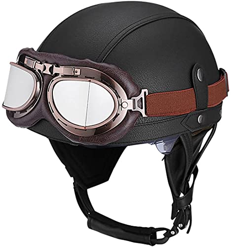 CFZWJ Motorcykelhjälm i retrostil, halvhjälm, unisex, PU-läder, motorcykelhjälmar med vintage-glasögon, årstider, utomhus-åkning, skoter, moped, DOT-godkänd hjälm