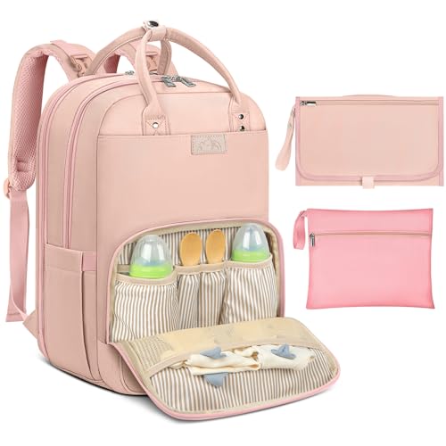 BabbleRoo Baby-skötväska/ryggsäck, skötryggsäck, vardagsskötväskor, multifunktionell babyväska med stor kapacitet, reseryggsäck med skötdyna och napphållare (rosa)