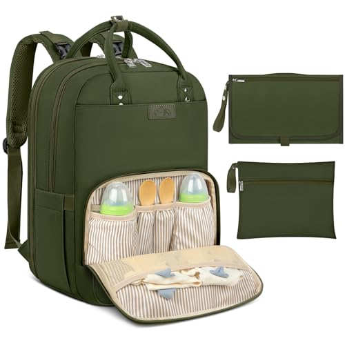BabbleRoo Babyskötväska/ryggsäck, skötryggsäck avslappnade skötväskor, multifunktionell stor kapacitet babyväska reseryggsäck med skötdyna & napphållare (militärgrön)