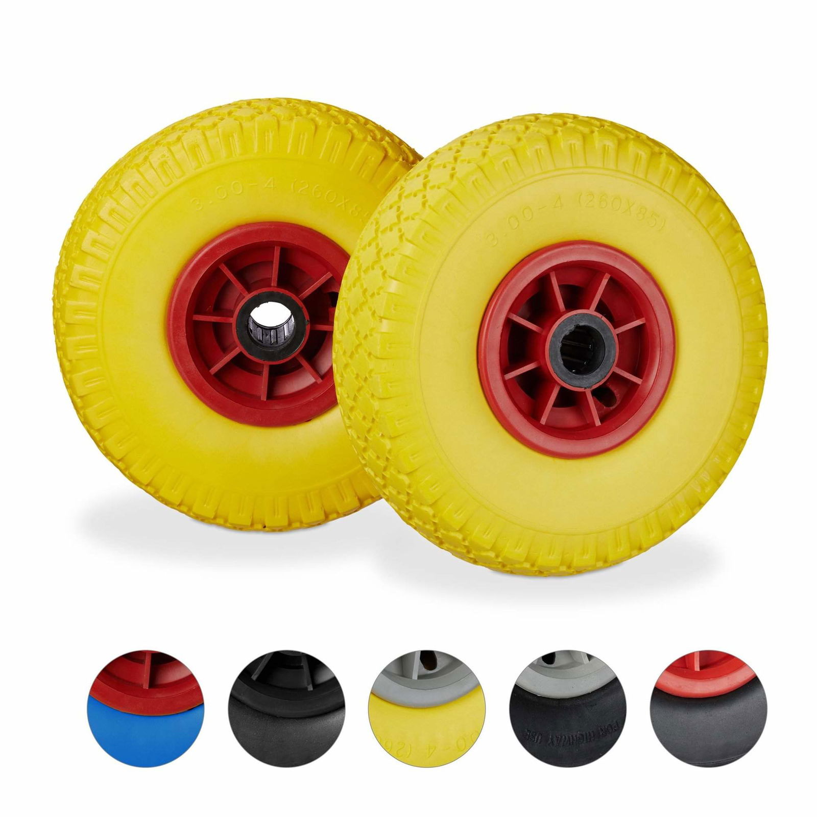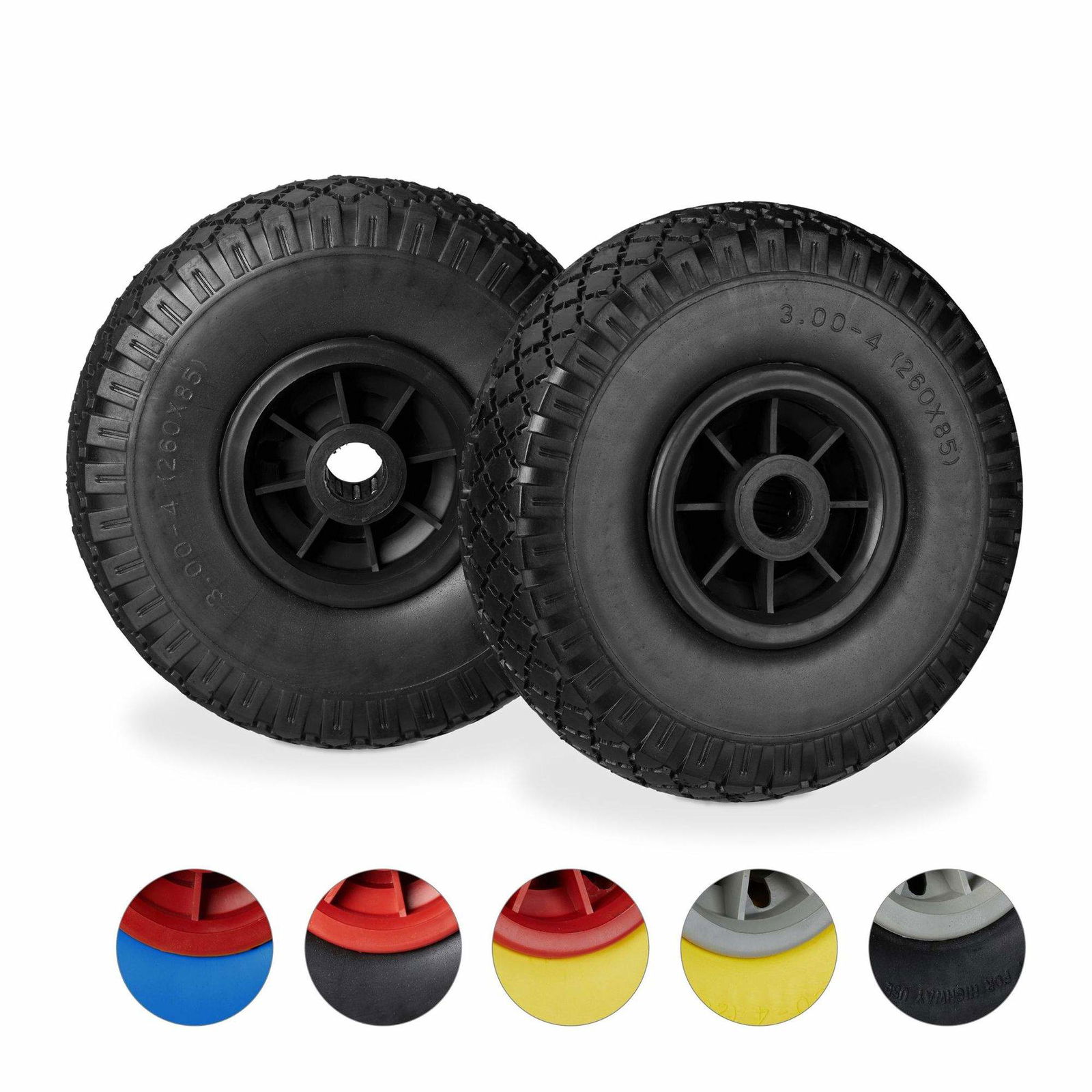 Relaxdays Skottkärrehjul set om 2, punkteringssäkra 3,00–4 tum solida gummidäck, 25 mm axel, upp till 80 kg, 260 x 85 mm, blå-röd