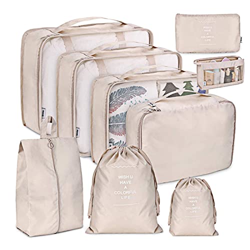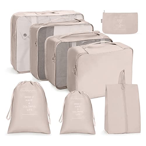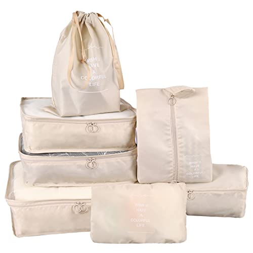 tianzong 7-delat set packkuber, resväskor för bagage, packningsorganiserare med skoväska (beige med en toalettväska), flera storlekar