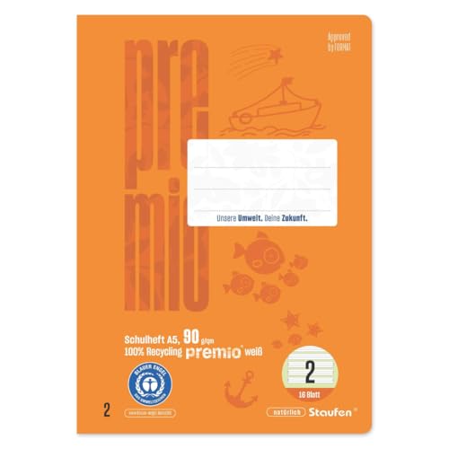 Staufen premio skrivbok – 10 häften vardera, 16 ark, DIN A5, linjerat 2 (4/4/4 mm linjerat, färglagd linjering), 90 g/m² återvunnet papper, runda hörn förhindrar "åsneöron"