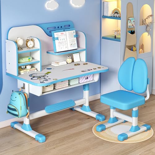 Kripyery Set för barn, skrivbord och stol, justerbara flickor pojkar skola skriva läxor studiebord, ergonomiska skrivbord med stor skrivbräda, bokhylla och låda blå