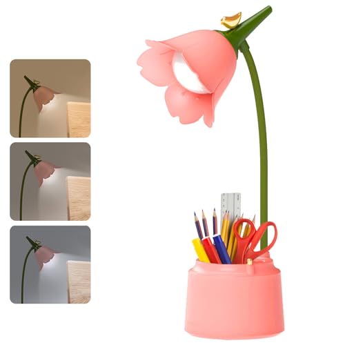 Dimbar LED-skrivbord för barn – 3 färgtemperaturer, USB-uppladdningsbar, touchsensor och flexibel arm, bord med pennhållare – ögonvänlig lä för flickor/pojkar (rosa)