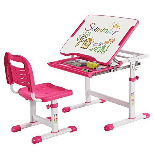 COSTWAY Skrivbord för barn, höjdjusterbart barnskrivbord med lutande bordsskiva och låda, multifunktionellt skrivbord med stol för pojkar och flickor (rosa)