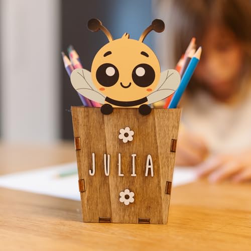 WONDEE Personligt namn Pennhållare i trä, Bin Skrivbord-Organisatör för Barn, Skolans Födelsedagspresenter för Barn, Skrivbordstillbehör för Pojkar och Flickor
