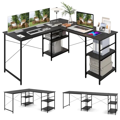 LIFEZEAL L-format skrivbord med hyllor, 242 cm vändbart hörnskrivbord, gaming laptop PC-bord i industriell stil, datorbord, arbetsstation för hem och kontor (svart)