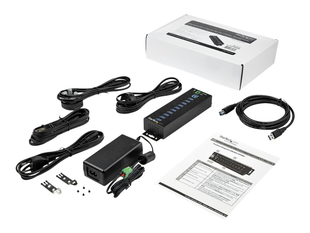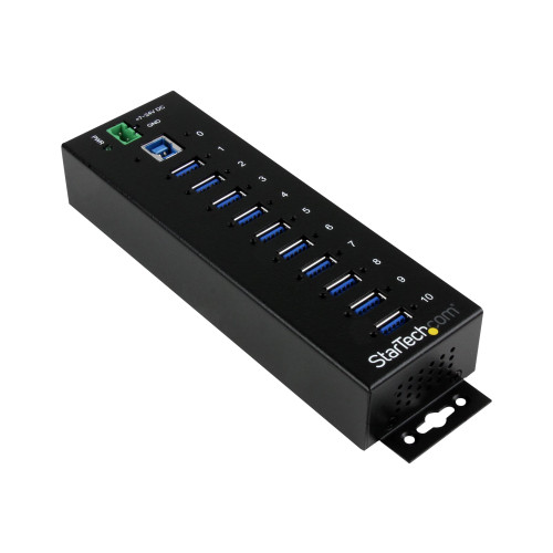 StarTech.com USB 3.0-hubb med 10 portar och nätadapter - Industriell USB-A-hubb i metall med ESD- och 350 W överspänningsskydd - Monterbar på DIN-skena/vägg/skrivbord - Höghastighets USB 3.1 Gen 1 5 Gbps-hubb - hubb - 10 portar - TAA-kompatibel