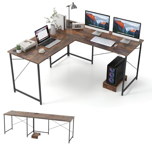 LIFEZEAL L-format skrivbord, 240 cm vändbart datorbord, hörnskrivbord med monitorstativ, gaming laptop PC-bord i industriell stil, arbetsstation för hem och kontor (brun)