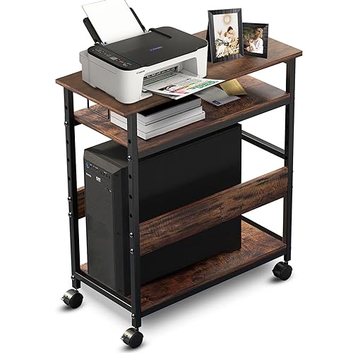 YMYNY Mobilt skrivarstativ, 3 nivåer under skrivbord, hemskrivarvagn på hjul, industriell höjd, justerbart trärullande skrivarbord för faxmaskin, skanner 44 × 30 × 82 cm rustik brun och svart HPT002H