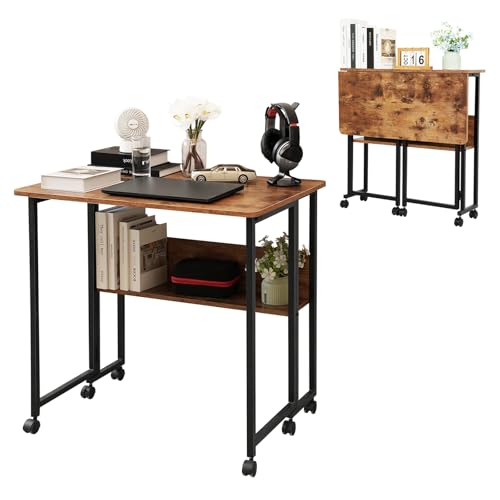 Skrivbord fällbart litet skrivbord med hjul 80 cm brett, litet datorbord med hylla, fällbart fällbart bord arbetsbord för hemmakontor, utrymmesbesparande, industriell design (retrofärg)