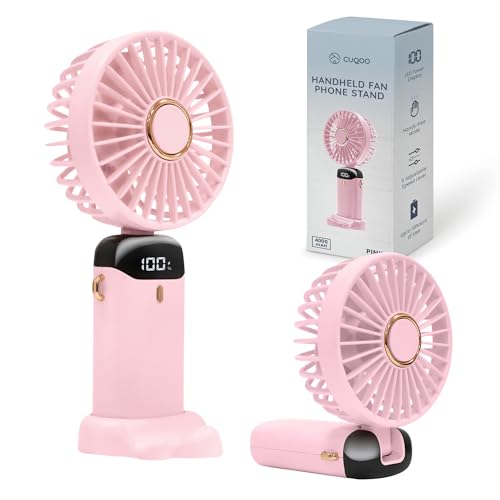 CUQOO Handhållen fläkt med telefonstativ i rosa – mini USB-uppladdningsbara fläktar med kraftfullt batteri (4 000 mAh) | Vikbar skrivbordsfläkt med 5 hastigheter och digital display | bärbar elektrisk