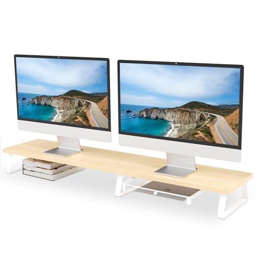 Aothia Stor stativ med dubbla bildskärmar – trä datorstativ med metallben, skrivbordsorganisatör med låda och underförvaring, skrivbordshylla för PC/skrivare/TV/bärbar dator, ek