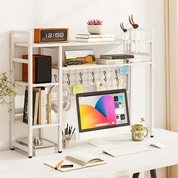 Vit Skrivbordshylla – skärmställ, desktop organizer och förvaringshylla med krokar