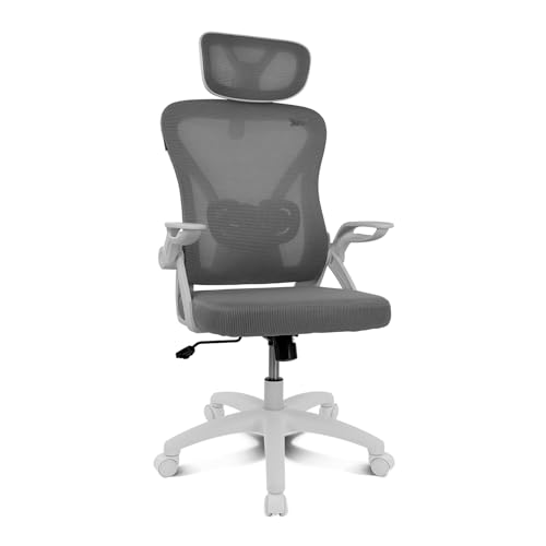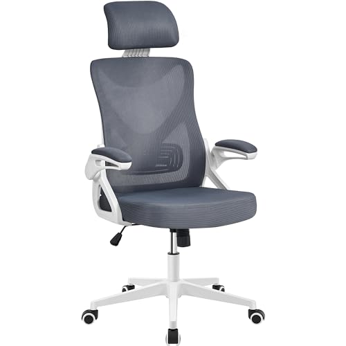 Yaheetech Kontorsstol ergonomisk, skrivbordsstol i mesh med hopfällbara armstöd, snurrstol med justerbart ländryggsstöd, chefsfåtölj, höjdjusterbar grå