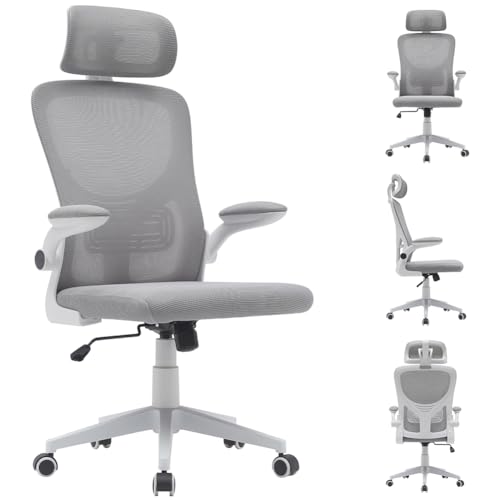 BAKAJI Ergonomisk skrivbordsstol i andningsbart och svettbeständigt tyg, ryggstöd med ländryggsstöd och nackstöd, studiestol kontor justerbar höjd till gas 116–126 cm (grå)