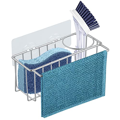 Självhäftande svamphållare för handfat, uppgraderad Andyer 3-i-1 diskbänk caddy, skrubb, borste, disktrasa, organisatör, SUS304 rostfritt stål rostfri vattentät, ingen borrning (silver)