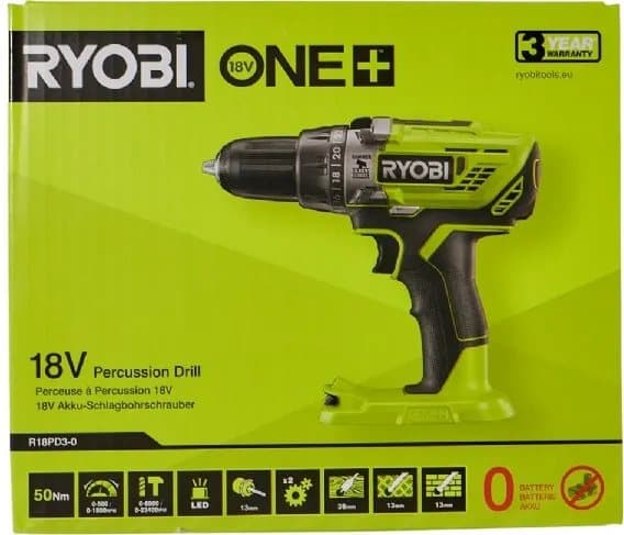 Ryobi One+ R18PD3-0 - Slagborr/skruvdragare - sladdlös - 2 hastigheter - nyckellös chuck 13 mm - 50 N·m - inget batteri - 18 V - Utan batteri och lad