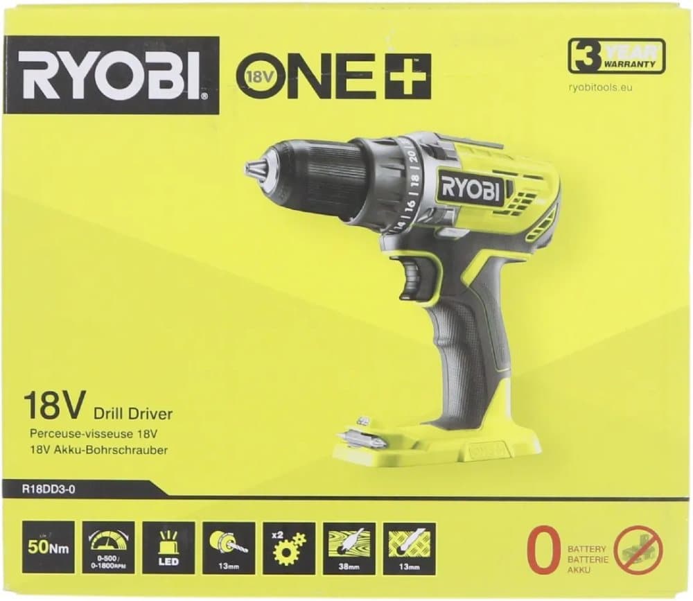 Ryobi One+ R18DD3-0 - Borr/drivare - sladdlös - 2 hastigheter - nyckellös chuck 13 mm - 50 N·m - inget batteri - 18 V - Utan batteri och laddare