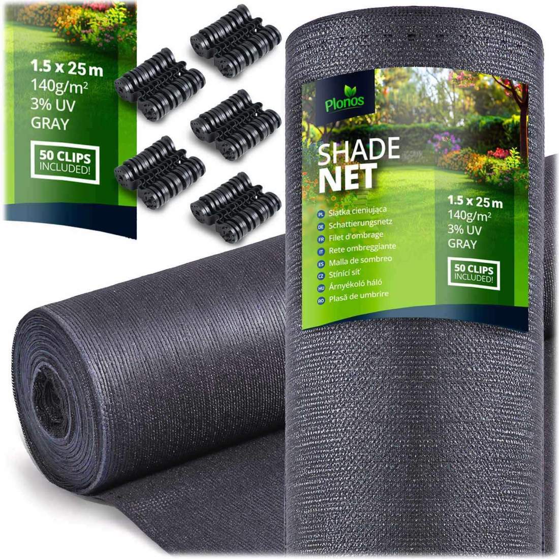 Skuggnät 1,5x25m 140g/m2 + 50 klämmor grå