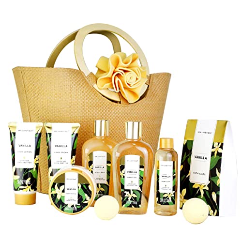 Bad presentset för kvinnor SPA LUXETIQUE 10 st. Set vaniljdoft – handkräm, duschgel, skumbad, kroppslotion, badsalt, badsvamp och rymlig handväska, bad presentset för mors dag gåva