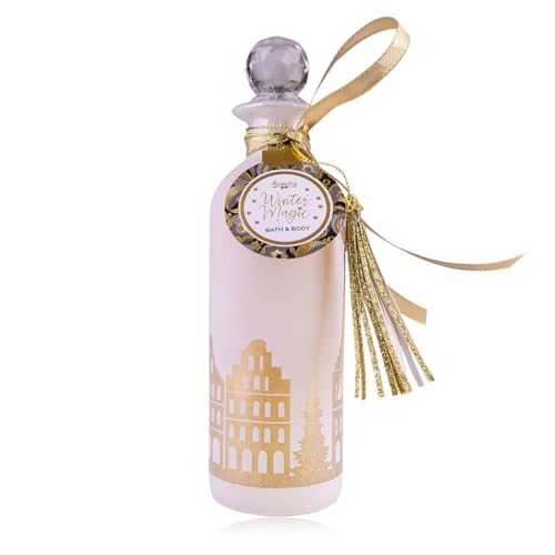 Accentra Skumbad WINTER MAGIC skumbad, duschskum, duschgel i glasflaska med skyline-print och gyllene tofs, 230ml, doft: Vanilj, julklapp kvinnor