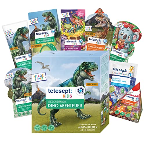 tetesept Kids presentförpackning dino äventyr – badtillsats presentset med bubbelbad, skumbad, badöverraskning och barndusch, badtillsatser med hudvårdande recept – uppsättning om 9