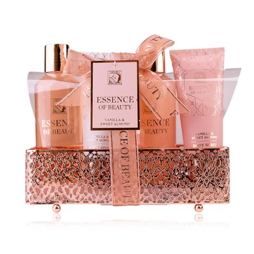 Accentra Badset SALSA ESSENCE OF BEAUTY för kvinnor i korg, med gel, skumbad, bodylotion, scrub, vanilj- och mandeldoft, lyxig gåva till kvinnor