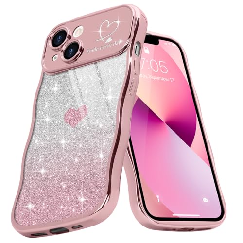 Teageo Sött hjärtmönster lockigt telefonfodral för iPhone 13, vågig ram, glitterfodral för flickor, kvinnor, estetisk bling, skydd, stötsäker, mjuk TPU-stötfångare för iPhone 13, rosa