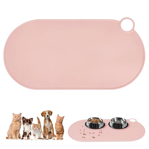 Adiwo Skålmatta för hund och katt, vattentät hundmatta med hål, premiumsilikon, halkfri och snabbtorkande, lätt att rengöra, husdjursmatta för kladdiga dryckesburar för att skydda golv (50x25cm, rosa)