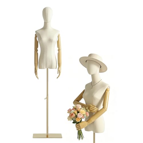 Kvinnlig skyltdockklänning i överkropp, skyltdocka, med avtagbart huvud, trähänder och gyllene justerbart höjdstativ, för klänning smyckesvisning, beige (guld)