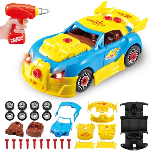 Pup Go Montering billeksak för barn 3-4 5–6 år, 26 + 4 delar gör-det-själv byggleksaker, bilar med borrmaskin, sladdlös skruvdragare, ljudbelysning, montering för pojkar