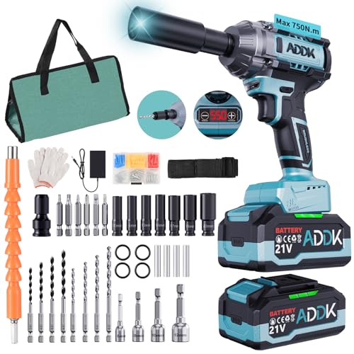 Mutterdragare, sladdlös, 1/2 tum, 21 V, 800 Nm-vridmoment, 9 insexhylsor, t.ex. 17, 18, 19 och 22 mm och ett 2-pack med litiumjonbatterier på 4 000 mAh, variabel hastighet, bra för bilhjul (blå)