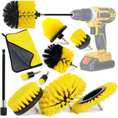 NCKIHRKK Borstfäste borrmaskinsset, paket med 10 borstfäste sladdlös skruvmejsel, borr rengöringsborste sladdlös skruvmejsel rengöringssats för bil, fälgar, kakel, golv, badkar (gul)