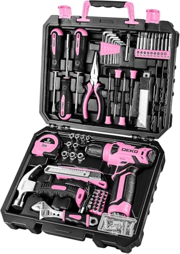 Verktygslåda sladdlös skruvmejsel verktygslåda, verktygssats, DEKO verktygslåda, set i 126 delar Professionell verktygslåda för hemmafixare, för kontor och trädgård, rosa