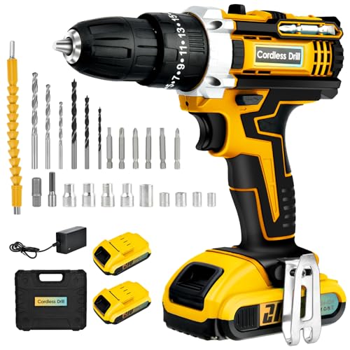 21 V sladdlös borr och skruvmejsel: med 2 batterier 2,0 Ah, 24 tillbehör för sladdlös borr, vridmoment 40 Nm, 25 + 3 kopplingsnivåer, lämplig för hushållsverktyg och industriellt bruk