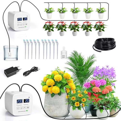 GuKKK Automatiskt bevattningssystem för trädgård och balkong, droppbevattningssats med 10 m slang, bil/manuell/smart mode för 15 krukväxter
