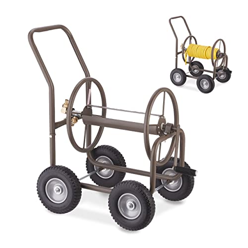 Relaxdays Slangvagn, upp till 60 m, 4 massiva gummidäck, klickkoppling, slangtrumma metall, slangrulle, brun