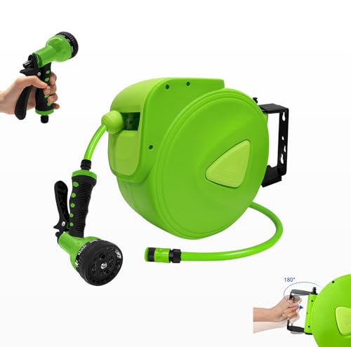 FIXFANS Slangrulle med slang, 1/4 tum x 18 m infällbar, kraftig, automatisk återspolning, väggmonterad, 3 600 PSI