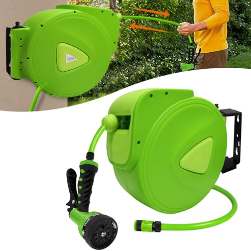Aufun slangvinda vatten 30m + 2m automatisk med handdusch och trädgårdsslang, 3/4" anslutning 180° vridbar, multiväggfäste med bärhandtag för trädgård, bevattning, biltvätt (grön)
