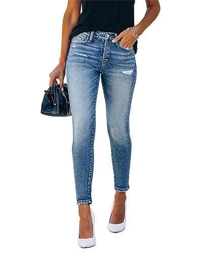 KUNMI Women's Mid Waisted Skinny Ripped Jeans Slim Fit Distressed Stretchy Denim Pants