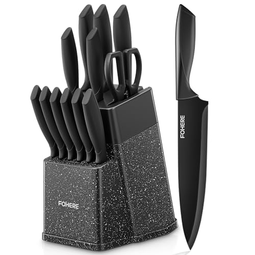 FOHERE Knivblock, 13 stycken, kökskniv med integrerad slipare, rostfritt stål, knivset med PP-handtag, med plastknivblock, svart granit