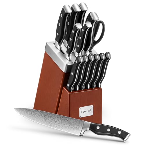 FOHERE Kökskniv, 14 stycken knivblock med integrerad slipare, kökskniv i rostfritt stål, rödbrunt träblock
